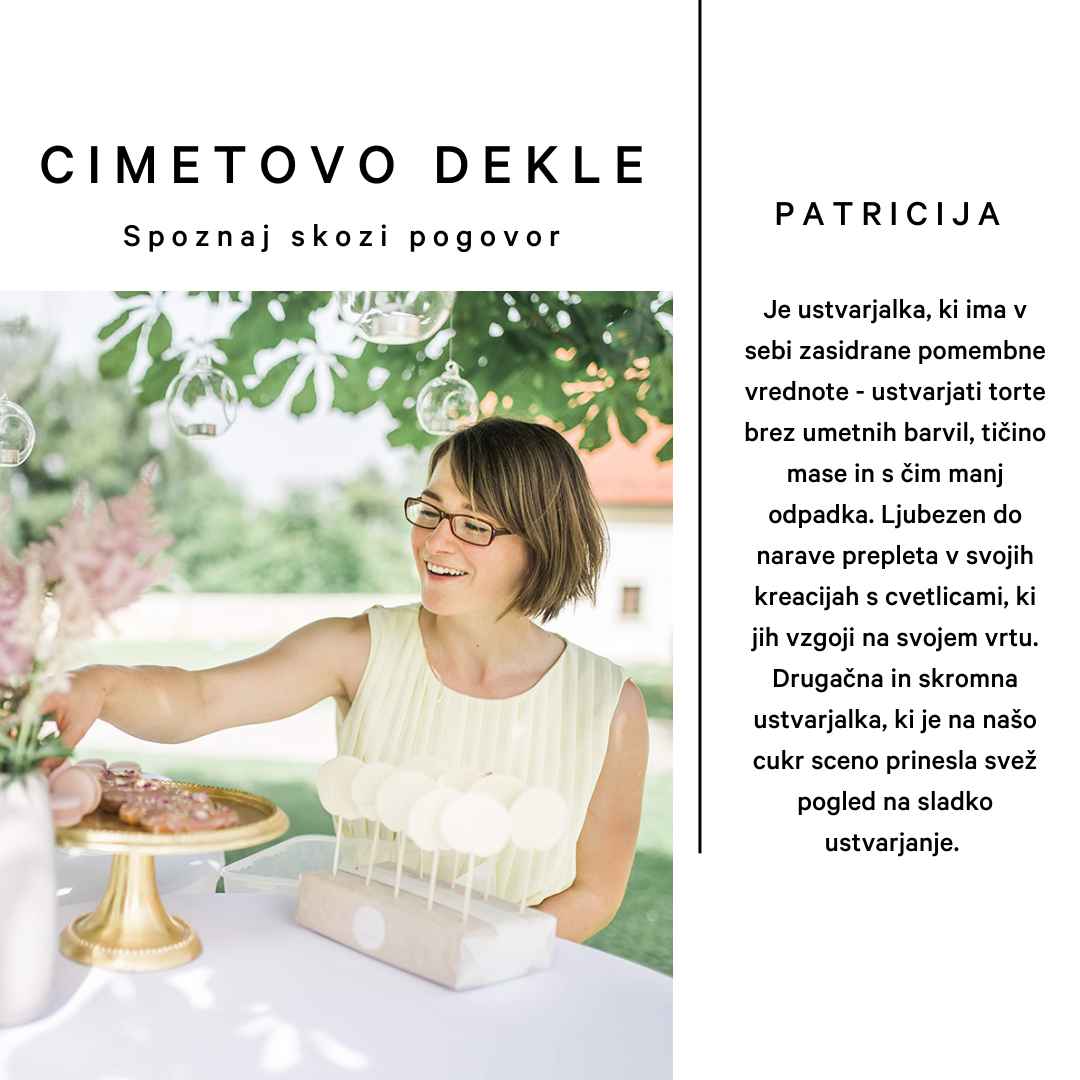 V reviji boste spoznali Patricijo – Cimetovo dekle, ki ustvarja naravne torte brez jedilnih barv in tičine mase. Njene močne vrednote so jo oblikovale v ustvarjalko, ki ustvarja v skladu z okoljem in se trudi da ob tem skrbi za naravo.